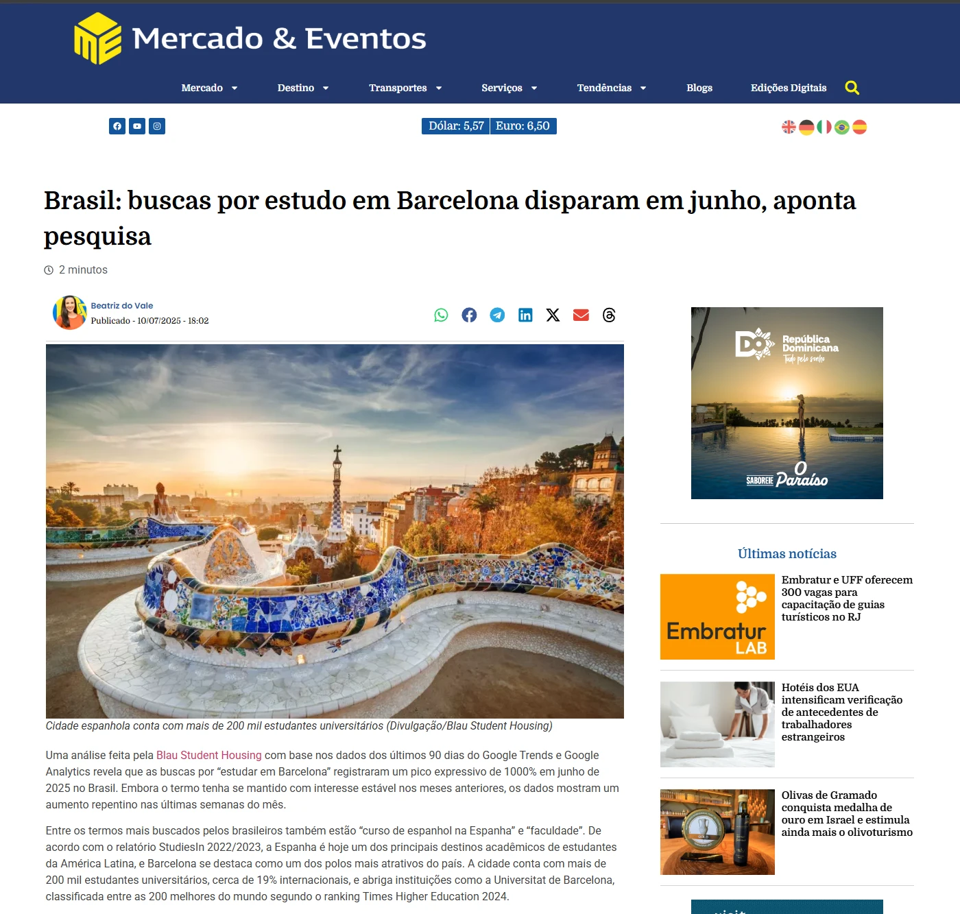 Uma análise feita pela Blau Student Housing com base nos dados dos últimos 90 dias do Google Trends e Google Analytics revela que as buscas por “estudar em Barcelona” registraram um pico expressivo de 1000% em junho de 2025 no Brasil. Embora o termo tenha se mantido com interesse estável nos meses anteriores, os dados mostram um aumento repentino nas últimas semanas do mês.
